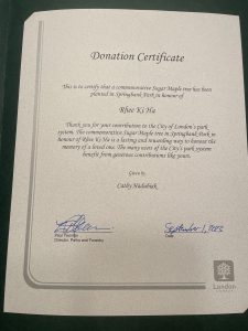 Great news today from the City of London!!! FGMR’s Sugar Maple tree has finally been planted in Springbank Park on the banks of the Thames River. Can’t wait to see what it looks like next year when it’s in bloom…… Happy 85th Birthday First Grand Master Rhee Ki Ha!!!